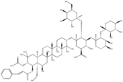 InChI=1S/C63H92O26/c1-28(66)82-51-52(85-39(70)17-14-29-12-10-9-11-13-29)63(27-65)31(22-58(51,2)3)30-15-16-36-60(6)20-19-38(59(4,5)35(60)18-21-61(36,7)62(30,8)23-37(63)69)84-57-50(89-55-45(76)43(74)42(73)34(24-64)83-55)47(46(77)48(87-57)53(78)79)86-56-49(41(72)33(68)26-81-56)88-54-44(75)40(71)32(67)25-80-54/h9-15,17,31-38,40-52,54-57,64-65,67-69,71-77H,16,18-27H2,1-8H3,(H,78,79)/b17-14+/t31-,32+,33-,34+,35-,36+,37+,38-,40-,41-,42-,43-,44+,45+,46-,47-,48-,49+,50+,51-,52-,54-,55-,56-,57+,60-,61+,62+,63-/m0/s1 |