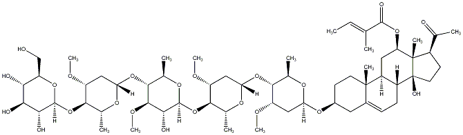 InChI=1S/C60H96O23/c1-14-27(2)55(67)79-42-22-37-36(60(68)20-18-35(28(3)62)59(42,60)9)16-15-33-21-34(17-19-58(33,37)8)77-43-23-38(69-10)50(29(4)73-43)80-44-24-39(70-11)52(31(6)74-44)83-57-49(66)54(72-13)53(32(7)76-57)81-45-25-40(71-12)51(30(5)75-45)82-56-48(65)47(64)46(63)41(26-61)78-56/h14-15,29-32,34-54,56-57,61,63-66,68H,16-26H2,1-13H3/b27-14+/t29-,30-,31-,32-,34+,35-,36-,37+,38+,39-,40-,41-,42-,43+,44+,45+,46-,47+,48-,49-,50-,51-,52-,53-,54-,56+,57+,58+,59+,60+/m1/s1 |