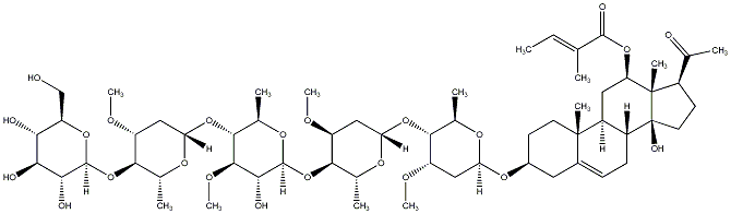 InChI=1S/C60H96O23/c1-14-27(2)55(67)79-42-22-37-36(60(68)20-18-35(28(3)62)59(42,60)9)16-15-33-21-34(17-19-58(33,37)8)77-43-23-38(69-10)50(29(4)73-43)80-44-24-39(70-11)52(31(6)74-44)83-57-49(66)54(72-13)53(32(7)76-57)81-45-25-40(71-12)51(30(5)75-45)82-56-48(65)47(64)46(63)41(26-61)78-56/h14-15,29-32,34-54,56-57,61,63-66,68H,16-26H2,1-13H3/b27-14+/t29-,30-,31-,32-,34+,35-,36-,37+,38+,39+,40-,41-,42-,43+,44+,45+,46-,47+,48-,49-,50-,51-,52-,53-,54-,56+,57+,58+,59+,60+/m1/s1 |