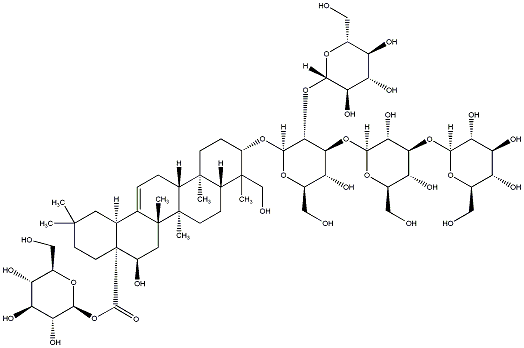 InChI=1S/C60H98O30/c1-55(2)13-14-60(54(80)90-51-44(78)41(75)36(70)27(19-63)83-51)24(15-55)23-7-8-31-56(3)11-10-33(57(4,22-66)30(56)9-12-58(31,5)59(23,6)16-32(60)67)86-53-48(89-50-43(77)40(74)35(69)26(18-62)82-50)47(38(72)29(21-65)85-53)88-52-45(79)46(37(71)28(20-64)84-52)87-49-42(76)39(73)34(68)25(17-61)81-49/h7,24-53,61-79H,8-22H2,1-6H3/t24-,25+,26+,27+,28+,29+,30+,31+,32+,33-,34+,35+,36+,37+,38+,39-,40-,41-,42+,43+,44+,45+,46-,47-,48+,49-,50-,51-,52-,53-,56-,57+,58+,59+,60+/m0/s1 |