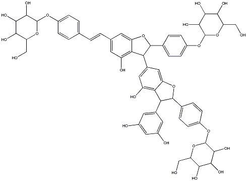 InChI=1S/C60H62O24/c61-22-40-47(68)50(71)53(74)58(82-40)77-33-9-3-25(4-10-33)1-2-26-15-36(66)45-38(16-26)80-57(28-7-13-35(14-8-28)79-60-55(76)52(73)49(70)42(24-63)84-60)44(45)30-19-37(67)46-39(20-30)81-56(43(46)29-17-31(64)21-32(65)18-29)27-5-11-34(12-6-27)78-59-54(75)51(72)48(69)41(23-62)83-59/h1-21,40-44,47-76H,22-24H2/b2-1+/t40-,41-,42-,43+,44+,47+,48-,49-,50-,51+,52+,53+,54-,55-,56-,57-,58-,59+,60+/m1/s1 |