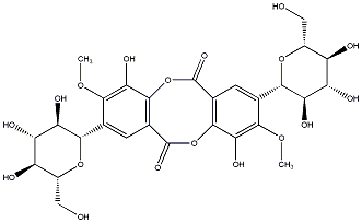 COc1c([C@@H]2O[C@H](CO)[C@@H](O)[C@H](O)[C@H]2O)cc2c(c1O)OC(=O)c1cc([C@@H]3O[C@H](CO)[C@@H](O)[C@H](O)[C@H]3O)c(OC)c(O)c1OC2=O |