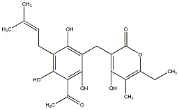 CCc1oc(=O)c(Cc2c(O)c(CC=C(C)C)c(O)c(C(C)=O)c2O)c(O)c1C |