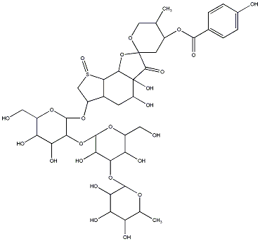 InChI=1S/C40H56O24S/c1-13-11-56-39(8-18(13)58-34(52)15-3-5-16(43)6-4-15)38(53)40(54)22(44)7-17-21(12-65(55)32(17)33(40)64-39)61-37-31(27(49)24(46)19(9-41)60-37)63-36-29(51)30(25(47)20(10-42)59-36)62-35-28(50)26(48)23(45)14(2)57-35/h3-6,13-14,17-33,35-37,41-51,54H,7-12H2,1-2H3/t13-,14+,17-,18-,19+,20-,21+,22-,23+,24+,25-,26-,27-,28+,29+,30+,31+,32-,33+,35-,36-,37-,39-,40-,65+/m1/s1 |