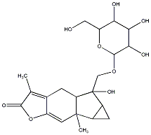InChI=1S/C21H28O9/c1-8-9-3-14-20(2,5-12(9)29-18(8)26)10-4-11(10)21(14,27)7-28-19-17(25)16(24)15(23)13(6-22)30-19/h5,10-11,13-17,19,22-25,27H,3-4,6-7H2,1-2H3/t10-,11+,13+,14-,15+,16-,17+,19+,20-,21+/m1/s1 |