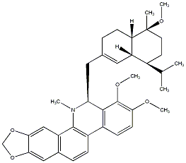 InChI=1S/C37H45NO5/c1-21(2)24-14-15-37(3,41-7)29-12-8-22(16-28(24)29)17-30-34-25(11-13-31(39-5)36(34)40-6)26-10-9-23-18-32-33(43-20-42-32)19-27(23)35(26)38(30)4/h9-11,13,16,18-19,21,24,28-30H,8,12,14-15,17,20H2,1-7H3/t24-,28+,29-,30-,37-/m0/s1 |