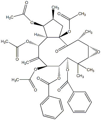 InChI=1S/C42H48O14/c1-21-20-42(56-27(7)46)30(31(21)50-24(4)43)32(51-25(5)44)22(2)33(52-26(6)45)35(54-39(48)28-16-12-10-13-17-28)38(55-40(49)29-18-14-11-15-19-29)41(8,9)37-34(53-37)23(3)36(42)47/h10-19,21,23,30-35,37-38H,2,20H2,1,3-9H3/t21-,23+,30+,31-,32-,33-,34-,35+,37-,38-,42+/m0/s1 |