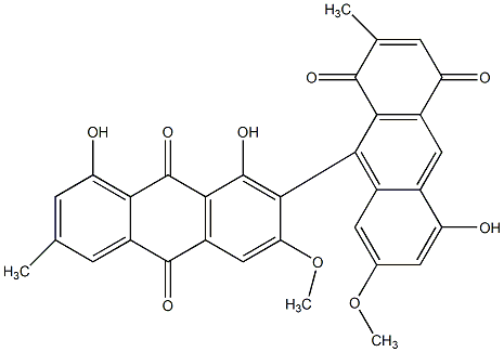 InChI=1S/C32H22O9/c1-12-5-18-24(22(35)6-12)31(38)27-19(30(18)37)11-23(41-4)28(32(27)39)25-16-8-14(40-3)9-21(34)15(16)10-17-20(33)7-13(2)29(36)26(17)25/h5-11,34-35,39H,1-4H3 |
