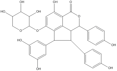 O=C1OC(c2ccc(O)cc2)C2c3c1c(O)cc(OC1OCC(O)C(O)C1O)c3C(c1cc(O)cc(O)c1)C2c1ccc(O)cc1 |