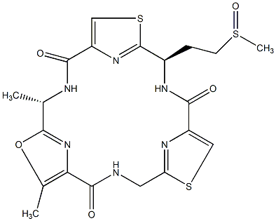 InChI=1S/C20H22N6O5S3/c1-9-19-26-15(10(2)31-19)18(29)21-6-14-23-12(7-32-14)17(28)24-11(4-5-34(3)30)20-25-13(8-33-20)16(27)22-9/h7-9,11H,4-6H2,1-3H3,(H,21,29)(H,22,27)(H,24,28)/t9-,11+,34+/m0/s1 |
