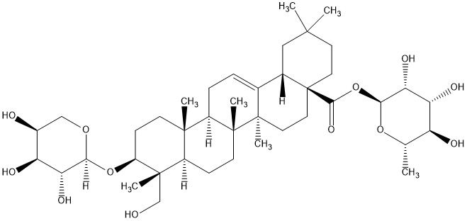 InChI=1S/C41H66O12/c1-21-28(44)30(46)32(48)34(51-21)53-35(49)41-16-14-36(2,3)18-23(41)22-8-9-26-37(4)12-11-27(52-33-31(47)29(45)24(43)19-50-33)38(5,20-42)25(37)10-13-40(26,7)39(22,6)15-17-41/h8,21,23-34,42-48H,9-20H2,1-7H3/t21-,23-,24-,25+,26+,27-,28-,29-,30+,31+,32+,33-,34-,37-,38-,39+,40+,41-/m0/s1 |