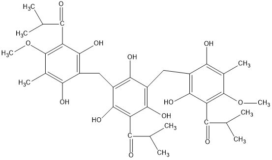 InChI=1S/C36H44O12/c1-13(2)25(37)22-31(43)20(11-18-28(40)16(7)35(47-9)23(33(18)45)26(38)14(3)4)30(42)21(32(22)44)12-19-29(41)17(8)36(48-10)24(34(19)46)27(39)15(5)6/h13-15,40-46H,11-12H2,1-10H3 |