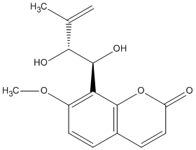 InChI=1/C15H16O5/c1-8(2)13(17)14(18)12-10(19-3)6-4-9-5-7-11(16)20-15(9)12/h4-7,13-14,17-18H,1H2,2-3H3/t13-,14+/s2 |