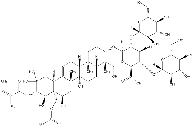 InChI=1S/C55H86O24/c1-10-23(2)46(71)79-44-43(68)55(22-72-24(3)59)26(17-50(44,4)5)25-11-12-30-51(6)15-14-32(52(7,21-58)29(51)13-16-53(30,8)54(25,9)18-31(55)60)75-49-41(77-48-38(66)36(64)34(62)28(20-57)74-48)39(67)40(42(78-49)45(69)70)76-47-37(65)35(63)33(61)27(19-56)73-47/h10-11,26-44,47-49,56-58,60-68H,12-22H2,1-9H3,(H,69,70)/b23-10-/t26-,27+,28+,29+,30+,31+,32-,33+,34+,35-,36-,37+,38+,39-,40-,41+,42-,43-,44-,47-,48-,49+,51-,52+,53+,54+,55-/m0/s1 |