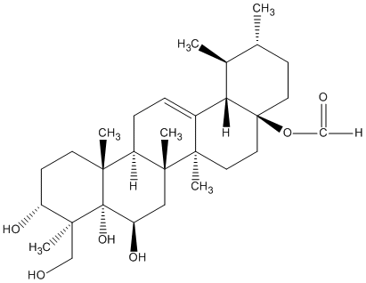 InChI=1S/C30H48O6/c1-17-9-12-29(24(34)35)14-13-25(3)19(23(29)18(17)2)7-8-20-26(4)11-10-21(32)28(6,16-31)30(26,36)22(33)15-27(20,25)5/h7,17-18,20-23,31-33,36H,8-16H2,1-6H3,(H,34,35)/t17-,18+,20-,21-,22-,23+,25-,26-,27-,28+,29+,30+/m1/s1 |