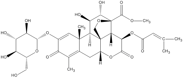 InChI=1S/C32H40O16/c1-11(2)6-17(34)48-23-25-31-10-44-32(25,29(42)43-5)26(40)22(39)24(31)30(4)8-14(18(35)12(3)13(30)7-16(31)47-27(23)41)45-28-21(38)20(37)19(36)15(9-33)46-28/h6,8,15-16,19-26,28,33,36-40H,7,9-10H2,1-5H3/t15-,16-,19-,20+,21-,22-,23-,24-,25-,26+,28-,30+,31-,32+/m1/s1 |