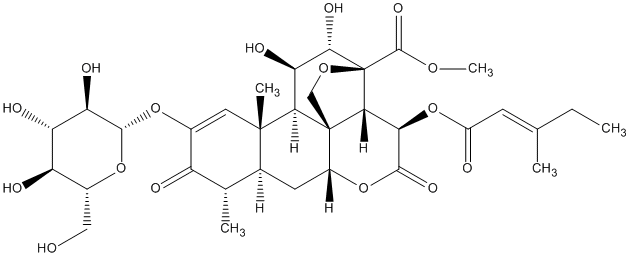InChI=1S/C33H44O16/c1-6-12(2)7-18(35)49-24-26-32-11-45-33(26,30(43)44-5)27(41)23(40)25(32)31(4)9-15(19(36)13(3)14(31)8-17(32)48-28(24)42)46-29-22(39)21(38)20(37)16(10-34)47-29/h7,9,13-14,16-17,20-27,29,34,37-41H,6,8,10-11H2,1-5H3/b12-7+/t13-,14-,16+,17+,20+,21-,22+,23+,24+,25+,26+,27-,29+,31-,32+,33-/m0/s1 |
