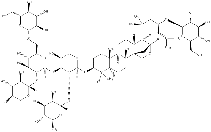 InChI=1S/C64H106O31/c1-24(2)15-26(88-57-50(81)45(76)41(72)32(19-66)90-57)16-63(8,82)37-27-9-10-35-61(6)13-12-36(60(4,5)34(61)11-14-62(35,7)64(27)17-30(37)86-23-64)92-58-53(95-56-49(80)43(74)38(69)25(3)87-56)51(29(68)21-84-58)93-59-52(94-55-47(78)39(70)28(67)20-83-55)46(77)42(73)33(91-59)22-85-54-48(79)44(75)40(71)31(18-65)89-54/h15,25-59,65-82H,9-14,16-23H2,1-8H3/t25-,26-,27+,28+,29-,30+,31+,32+,33+,34-,35+,36-,37+,38-,39-,40+,41+,42+,43+,44-,45-,46-,47+,48+,49+,50+,51-,52+,53+,54+,55-,56-,57+,58-,59-,61-,62+,63-,64-/m0/s1 |