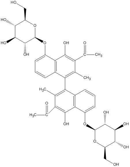 InChI=1S/C38H42O16/c1-13-23(15(3)41)31(45)27-17(7-5-9-19(27)51-37-35(49)33(47)29(43)21(11-39)53-37)25(13)26-14(2)24(16(4)42)32(46)28-18(26)8-6-10-20(28)52-38-36(50)34(48)30(44)22(12-40)54-38/h5-10,21-22,29-30,33-40,43-50H,11-12H2,1-4H3/t21-,22-,29-,30-,33+,34+,35-,36-,37-,38-/m1/s1 |