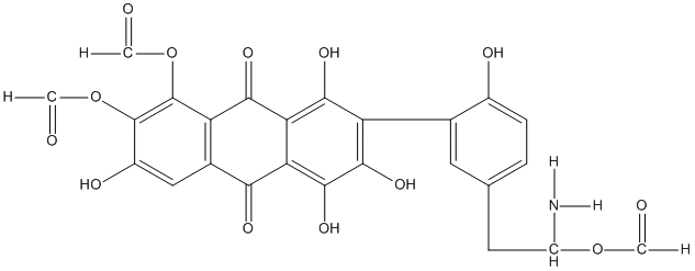 NC(Cc1ccc(O)c(-c2c(O)c(O)c3c(c2O)C(=O)c2c(cc(O)c(OC=O)c2OC=O)C3=O)c1)OC=O |