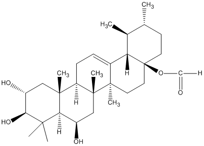 InChI=1S/C30H48O5/c1-16-10-11-30(25(34)35)13-12-28(6)18(22(30)17(16)2)8-9-21-27(5)14-20(32)24(33)26(3,4)23(27)19(31)15-29(21,28)7/h8,16-17,19-24,31-33H,9-15H2,1-7H3,(H,34,35)/t16-,17+,19-,20-,21-,22+,23+,24+,27-,28-,29-,30+/m1/s1 |