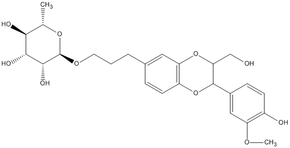 InChI=1S/C25H32O10/c1-13-21(28)22(29)23(30)25(33-13)32-9-3-4-14-5-8-17-19(10-14)34-20(12-26)24(35-17)15-6-7-16(27)18(11-15)31-2/h5-8,10-11,13,20-30H,3-4,9,12H2,1-2H3/t13-,20?,21-,22+,23+,24?,25+/m0/s1 |