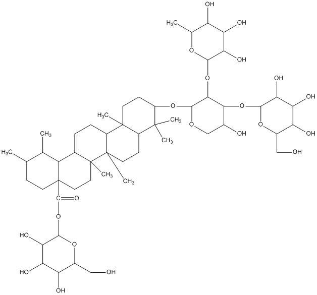 InChI=1S/C53H86O21/c1-22-11-16-53(48(66)74-46-41(65)38(62)35(59)28(20-55)70-46)18-17-51(7)25(32(53)23(22)2)9-10-30-50(6)14-13-31(49(4,5)29(50)12-15-52(30,51)8)71-47-43(73-44-39(63)36(60)33(57)24(3)68-44)42(26(56)21-67-47)72-45-40(64)37(61)34(58)27(19-54)69-45/h9,22-24,26-47,54-65H,10-21H2,1-8H3 |