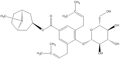 InChI=1S/C31H45NO8/c1-17(2)6-8-19-12-21(30(37)38-24-14-22-10-11-23(15-24)32(22)5)13-20(9-7-18(3)4)29(19)40-31-28(36)27(35)26(34)25(16-33)39-31/h6-7,12-13,22-28,31,33-36H,8-11,14-16H2,1-5H3/t22-,23+,24+,25-,26-,27+,28-,31+/m1/s1 |