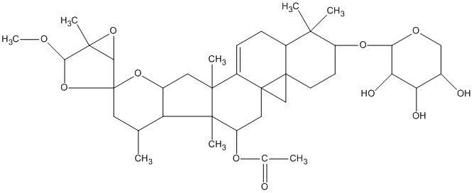 InChI=1S/C38H56O11/c1-18-13-38(30-35(7,48-30)31(43-8)49-38)47-21-14-33(5)23-10-9-22-32(3,4)24(46-29-28(42)27(41)20(40)16-44-29)11-12-36(22)17-37(23,36)15-25(45-19(2)39)34(33,6)26(18)21/h10,18,20-22,24-31,40-42H,9,11-17H2,1-8H3 |