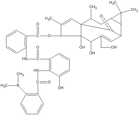 InChI=1S/C43H47N3O9/c1-22-20-42-23(2)18-29-33(41(29,3)4)28(36(42)50)19-24(21-47)35(49)43(42,54)37(22)55-40(53)25-12-7-9-15-30(25)44-39(52)27-14-11-17-32(48)34(27)45-38(51)26-13-8-10-16-31(26)46(5)6/h7-17,19-20,23,28-29,33,35,37,47-49,54H,18,21H2,1-6H3,(H,44,52)(H,45,51) |