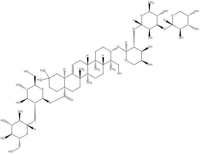 InChI=1S/C58H94O26/c1-24-34(64)44(81-47-41(71)35(65)27(62)21-75-47)43(73)49(77-24)82-45-36(66)28(63)22-76-50(45)80-33-11-12-54(4)31(55(33,5)23-61)10-13-57(7)32(54)9-8-25-26-18-53(2,3)14-16-58(26,17-15-56(25,57)6)52(74)84-51-46(40(70)38(68)30(20-60)79-51)83-48-42(72)39(69)37(67)29(19-59)78-48/h8,24,26-51,59-73H,9-23H2,1-7H3/t24-,26-,27-,28-,29+,30+,31+,32+,33-,34-,35-,36-,37+,38+,39-,40-,41+,42+,43+,44+,45+,46+,47-,48-,49-,50-,51-,54-,55-,56+,57+,58-/m0/s1 |