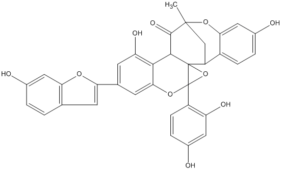 InChI=1S/C34H24O10/c1-32-14-22(20-6-4-19(37)13-27(20)42-32)33-30(31(32)40)29-24(39)8-16(25-9-15-2-3-18(36)12-26(15)41-25)10-28(29)43-34(33,44-33)21-7-5-17(35)11-23(21)38/h2-13,22,30,35-39H,14H2,1H3 |