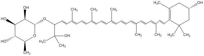 InChI=1S/C46H66O7/c1-31(17-12-13-18-32(2)20-15-23-34(4)25-27-39-36(6)29-38(47)30-45(39,8)9)19-14-21-33(3)22-16-24-35(5)26-28-40(46(10,11)51)53-44-43(50)42(49)41(48)37(7)52-44/h12-28,37-38,40-44,47-51H,29-30H2,1-11H3/b13-12+,19-14+,20-15+,22-16+,27-25+,28-26+,31-17+,32-18+,33-21+,34-23+,35-24+/t37-,38-,40?,41-,42+,43+,44-/m0/s1 |