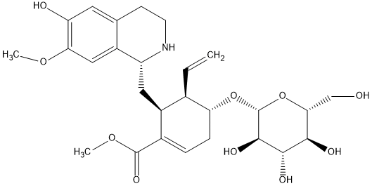 InChI=1S/C27H37NO10/c1-4-14-17(10-18-16-11-21(35-2)19(30)9-13(16)7-8-28-18)15(26(34)36-3)5-6-20(14)37-27-25(33)24(32)23(31)22(12-29)38-27/h4-5,9,11,14,17-18,20,22-25,27-33H,1,6-8,10,12H2,2-3H3/t14-,17+,18-,20-,22-,23-,24+,25-,27-/m1/s1 |