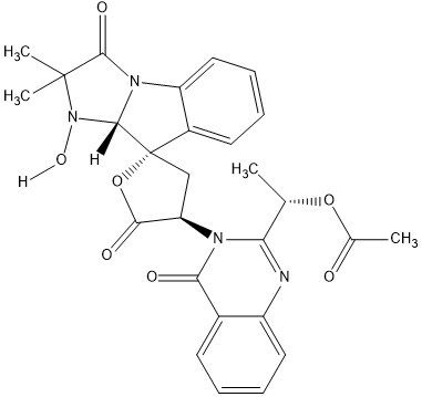 CC(=O)O[C@@H](C)c1nc2ccccc2c(=O)n1[C@@H]1C[C@]2(OC1=O)c1ccccc1N1C(=O)C(C)(C)N(O)[C@H]12 |