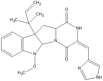 C=CC(C)(C)C12CC3C(=O)N/C(=C/c4c[nH]cn4)C(=O)N3C1N(OC)c1ccccc12 |
