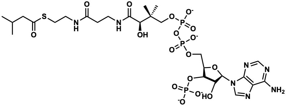 InChI=1S/C26H44N7O17P3S/c1-14(2)9-17(35)54-8-7-28-16(34)5-6-29-24(38)21(37)26(3,4)11-47-53(44,45)50-52(42,43)46-10-15-20(49-51(39,40)41)19(36)25(48-15)33-13-32-18-22(27)30-12-31-23(18)33/h12-15,19-21,25,36-37H,5-11H2,1-4H3,(H,28,34)(H,29,38)(H,42,43)(H,44,45)(H2,27,30,31)(H2,39,40,41)/p-4/t15-,19-,20-,21-,25?/m0/s1 |