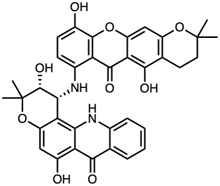 CC1(C)CCc2c(cc3oc4c(O)ccc(N[C@@H]5c6c(cc(O)c7c(=O)c8ccccc8[nH]c67)OC(C)(C)[C@@H]5O)c4c(=O)c3c2O)O1 |