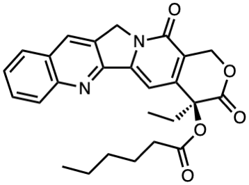 CCCCCC(=O)O[C@]1(CC)C(=O)OCc2c1cc1n(c2=O)Cc2cc3ccccc3nc2-1 |