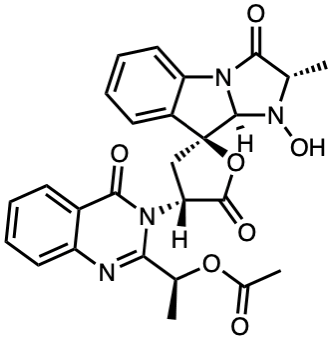 CC(=O)O[C@@H](C)c1nc2ccccc2c(=O)n1[C@@H]1C[C@]2(OC1=O)c1ccccc1N1C(=O)[C@H](C)N(O)[C@H]12 |