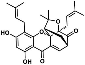 InChI=1S/C28H32O6/c1-14(2)7-8-17-19(29)13-20(30)22-23(31)18-11-16-12-21-26(5,6)34-27(25(16)32,10-9-15(3)4)28(18,21)33-24(17)22/h7,9,11,13,16,21,29-30H,8,10,12H2,1-6H3/t16-,21+,27+,28-/m1/s1 |