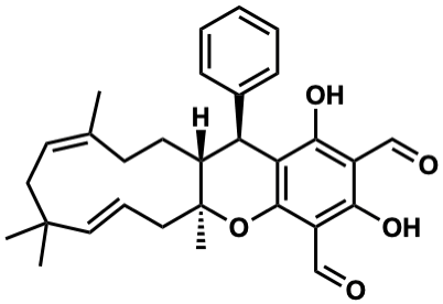 C/C1=C/CC(C)(C)/C=C/C[C@]2(C)Oc3c(C=O)c(O)c(C=O)c(O)c3[C@H](c3ccccc3)[C@H]2CC1 |