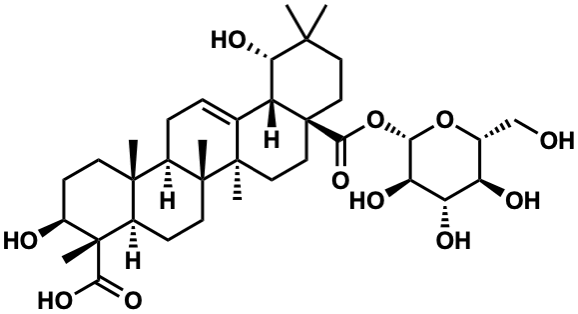 InChI=1S/C36H56O11/c1-31(2)13-15-36(30(45)47-28-26(41)25(40)24(39)19(17-37)46-28)16-14-33(4)18(23(36)27(31)42)7-8-20-32(3)11-10-22(38)35(6,29(43)44)21(32)9-12-34(20,33)5/h7,19-28,37-42H,8-17H2,1-6H3,(H,43,44)/t19-,20-,21-,22+,23-,24-,25+,26-,27+,28+,32-,33-,34-,35+,36+/m1/s1 |