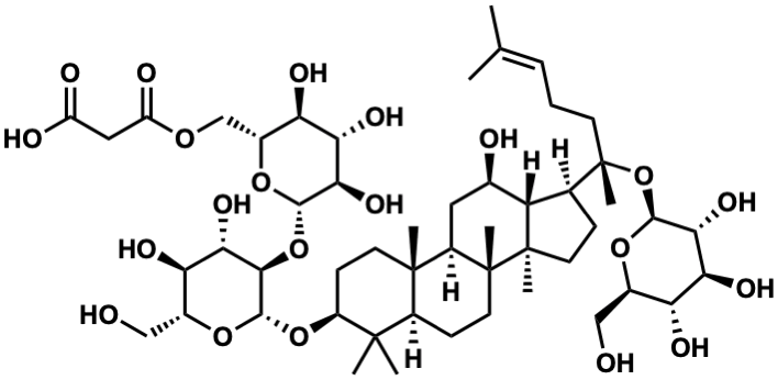 InChI=1S/C51H84O21/c1-23(2)10-9-14-51(8,72-45-42(65)38(61)35(58)26(20-52)67-45)24-11-16-50(7)34(24)25(54)18-30-48(5)15-13-31(47(3,4)29(48)12-17-49(30,50)6)70-46-43(40(63)36(59)27(21-53)68-46)71-44-41(64)39(62)37(60)28(69-44)22-66-33(57)19-32(55)56/h10,24-31,34-46,52-54,58-65H,9,11-22H2,1-8H3,(H,55,56)/t24-,25+,26+,27+,28+,29-,30+,31-,34-,35+,36+,37+,38-,39-,40-,41+,42+,43+,44-,45-,46-,48-,49+,50+,51-/m0/s1 |