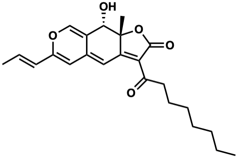 InChI=1S/C23H28O5/c1-4-6-7-8-9-11-19(24)20-18-13-15-12-16(10-5-2)27-14-17(15)21(25)23(18,3)28-22(20)26/h5,10,12-14,21,25H,4,6-9,11H2,1-3H3/b10-5+/t21-,23+/m0/s1 |
