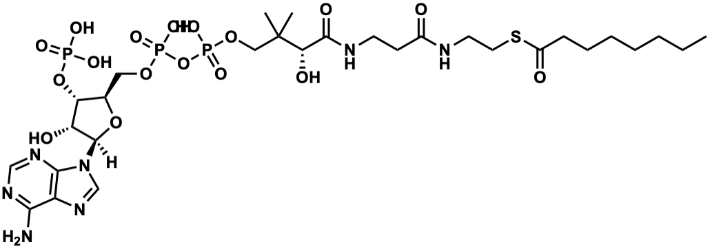 InChI=1S/C29H50N7O17P3S/c1-4-5-6-7-8-9-20(38)57-13-12-31-19(37)10-11-32-27(41)24(40)29(2,3)15-50-56(47,48)53-55(45,46)49-14-18-23(52-54(42,43)44)22(39)28(51-18)36-17-35-21-25(30)33-16-34-26(21)36/h16-18,22-24,28,39-40H,4-15H2,1-3H3,(H,31,37)(H,32,41)(H,45,46)(H,47,48)(H2,30,33,34)(H2,42,43,44)/t18-,22-,23-,24+,28-/m1/s1 |