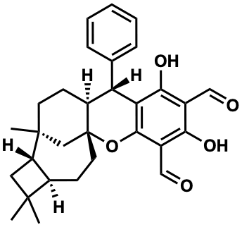 InChI=1S/C30H34O5/c1-28(2)13-22-20(28)10-12-30-16-29(22,3)11-9-21(30)23(17-7-5-4-6-8-17)24-26(34)18(14-31)25(33)19(15-32)27(24)35-30/h4-8,14-15,20-23,33-34H,9-13,16H2,1-3H3/t20-,21+,22+,23+,29+,30-/m1/s1 |