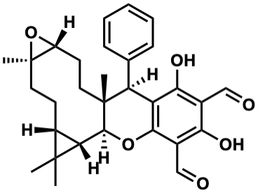 CC1(C)[C@@H]2[C@H]1CC[C@@]1(C)O[C@@H]1CC[C@]1(C)[C@@H](c3ccccc3)c3c(O)c(C=O)c(O)c(C=O)c3O[C@@H]21 |