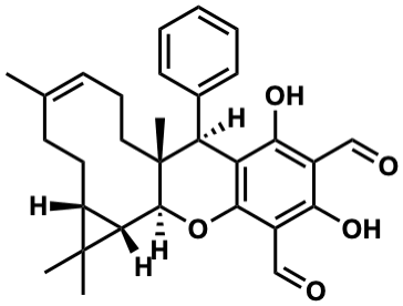 InChI=1S/C30H34O5/c1-17-9-8-14-30(4)23(18-10-6-5-7-11-18)22-26(34)19(15-31)25(33)20(16-32)27(22)35-28(30)24-21(13-12-17)29(24,2)3/h5-7,9-11,15-16,21,23-24,28,33-34H,8,12-14H2,1-4H3/b17-9-/t21-,23+,24-,28+,30-/m1/s1 |