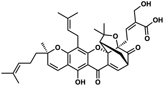 InChI=1S/C38H44O9/c1-20(2)9-8-14-36(7)15-13-24-29(40)28-30(41)26-17-23-18-27-35(5,6)47-37(33(23)42,16-12-22(19-39)34(43)44)38(26,27)46-32(28)25(31(24)45-36)11-10-21(3)4/h9-10,12-13,15,17,23,27,39-40H,8,11,14,16,18-19H2,1-7H3,(H,43,44)/b22-12-/t23-,27+,36-,37+,38-/m1/s1 |